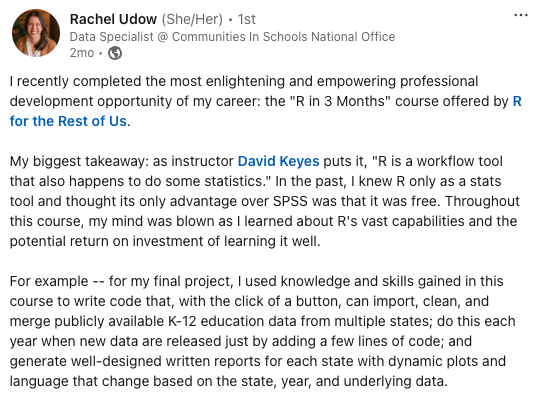 Rachel Udow will share her experience in R in 3 Months